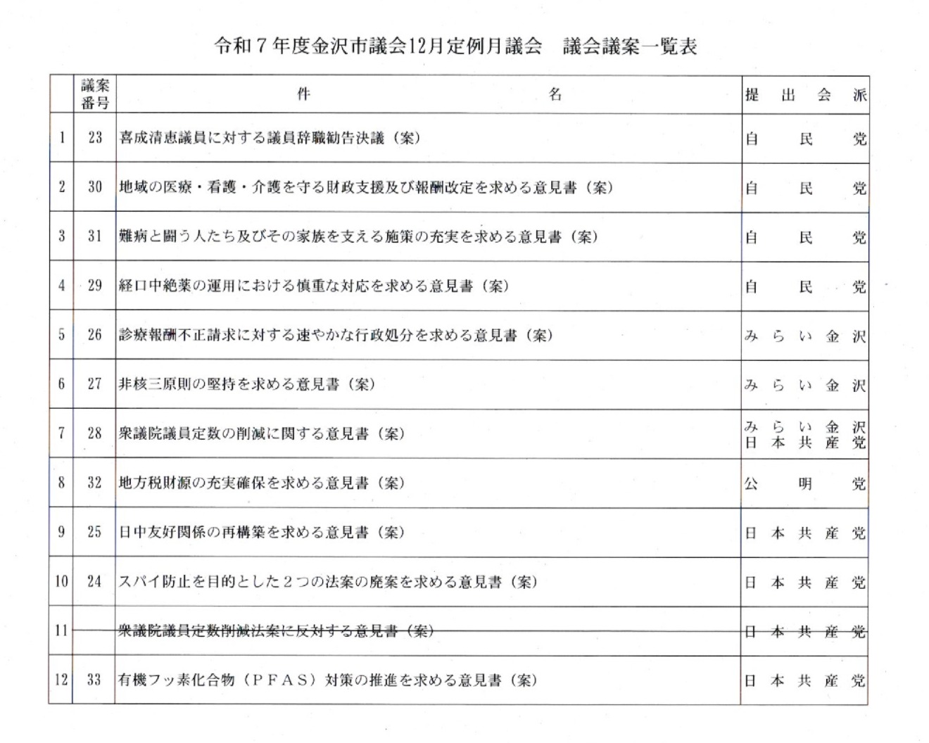 みらい金沢から提出した一覧順5、6、7は、いずれも自民系の反対により、少数否決で不採択終わりました。