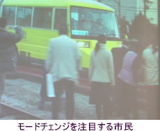 鉄輪が線路上で上下し、鉄路から道路を10秒程度のモードチェンジで行ったり来たりする。その車両はマイクロバスを改造して2000万円程度で作られる。最小限のコストで、赤字路線の存続を可能にする。富士市には、岳南鉄道という私鉄線、製紙工場の引き込み線が既存インフラとしてあるのです。それらと道路をつなぐことで、全市的広域公共交通幹線が形成できるわけです。北海道以外ではじめて、富士市市民を乗せて、モニター実験が行われ、映像が紹介されました。市民に大変好評とのことです。用意周到、緻密に導入共用までのスケジュールが策定されていました。目途は5年後です。