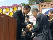 | 崔郡守から永年の功績を称えて功労者表彰を受ける朴さん、翫正敏顕揚会会長 |